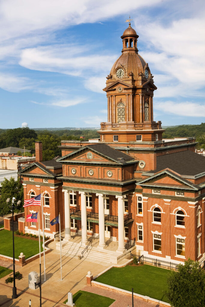 Listed on the National Register of Historic Places, the 1904 classic revival courthouse anchors Coweta’s town square. Its dome rises 100 feet above street level, and a four-face tower clock chimes the hour. The dome is covered with 13,500 pounds of copper to match the cornice, pediments and railings. The courthouse is also the site of the infamous “Murder in Coweta County” trial.
